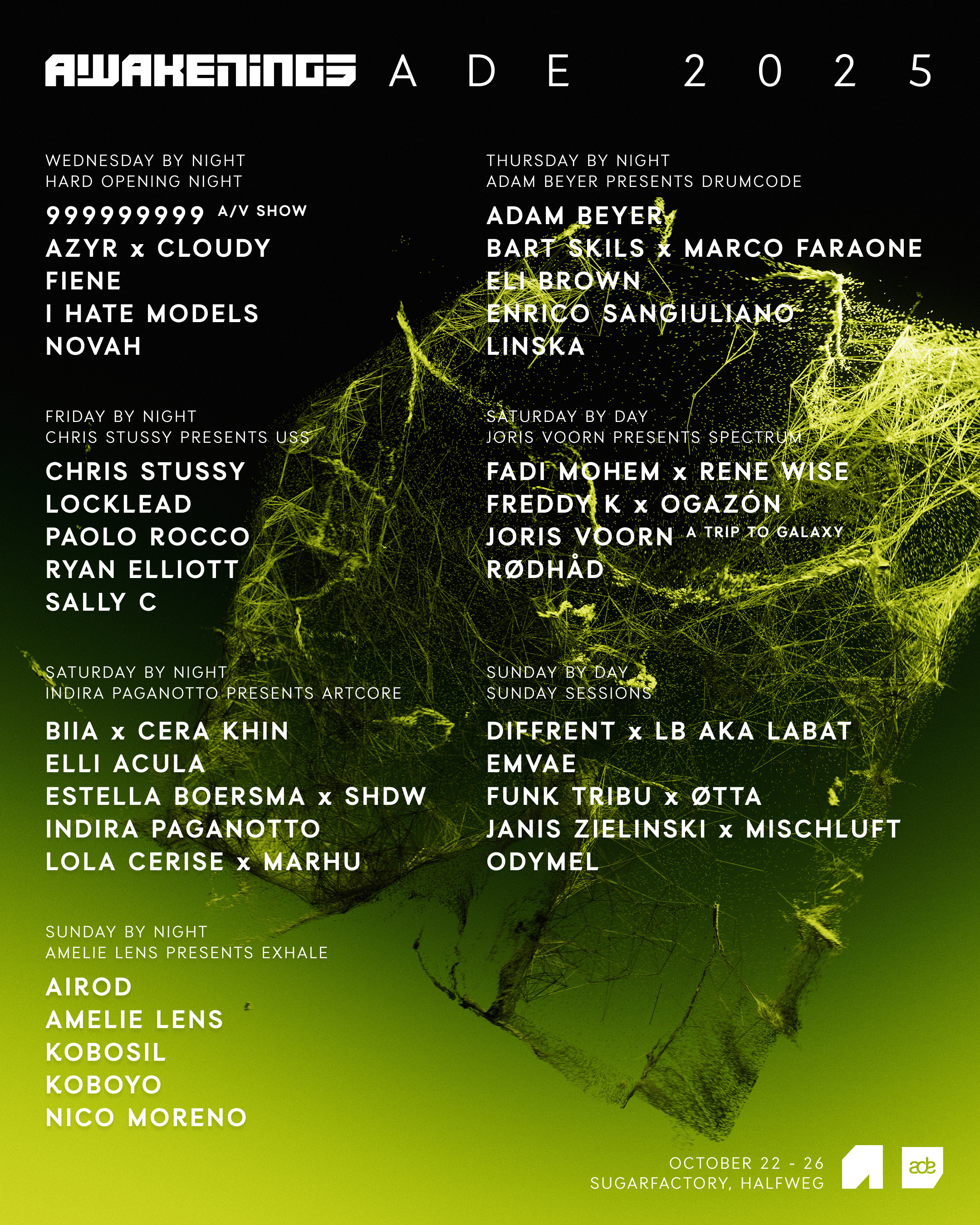 Uma estreia sob o selo Awakenings. ARTCORE traz Indira Paganotto, Elli Acula, Lola Cerise & Marhu, e um B2B de estreia entre Estella Boersma × SHDW. Uma fusão de techno, psytrance e hard techno, livre de regras.