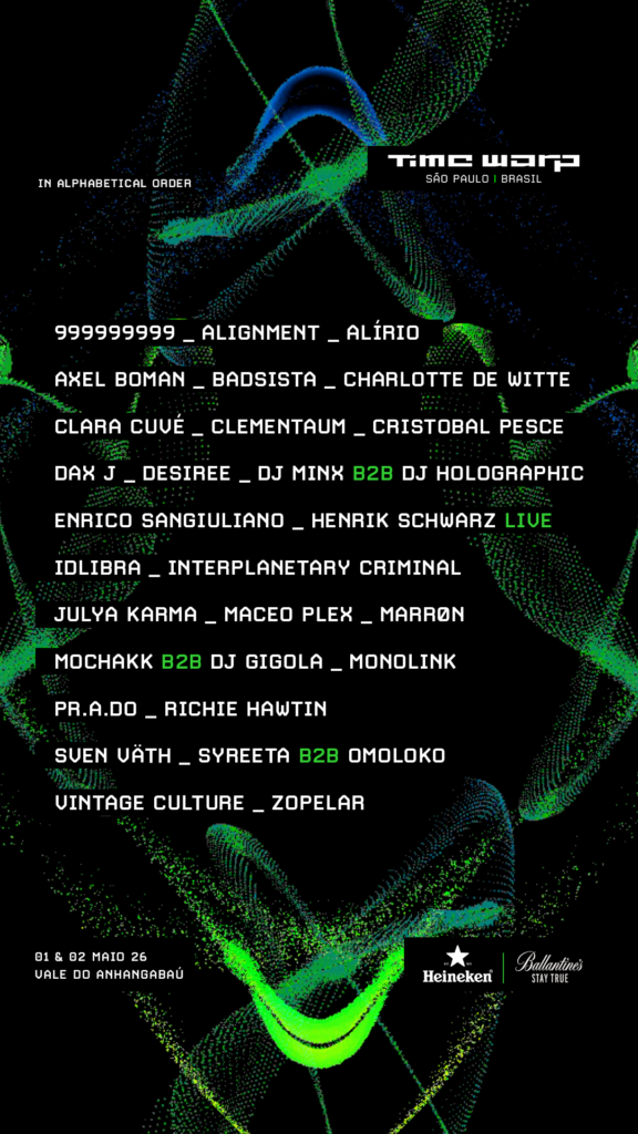 Nos dias 01 e 02 de maio de 2026, no Vale do Anhangabaú, o Time Warp Brasil recebe este time de artistas, do Techno ao House, para duas noites de música, luzes e movimentos no centro da cidade de São Paulo.