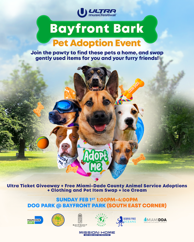 O ‘Bayfront Bark’ é um evento de adoção de animais lançado no ano passado em parceria com os Serviços de Animais do Condado de Miami-Dade e o Departamento de Polícia da Cidade de Miami. Após o sucesso da edição inaugural, o evento regressa em 2026 para apoiar o bem-estar animal local e ajudar a ligar animais disponíveis para adoção a lares definitivos. Vários animais estarão presentes para que os interessados possam conhecê-los e brincar com eles. Todas as adoções funcionam por ordem de chegada, mediante apresentação de documento de identificação com fotografia, e são patrocinadas pelo Ultra, sendo gratuitas para as famílias adotantes. Os participantes podem também doar lençóis e toalhas limpos e usados aos Serviços de Animais do Condado de Miami-Dade, para utilização como mantas, toalhas ou panos de limpeza.