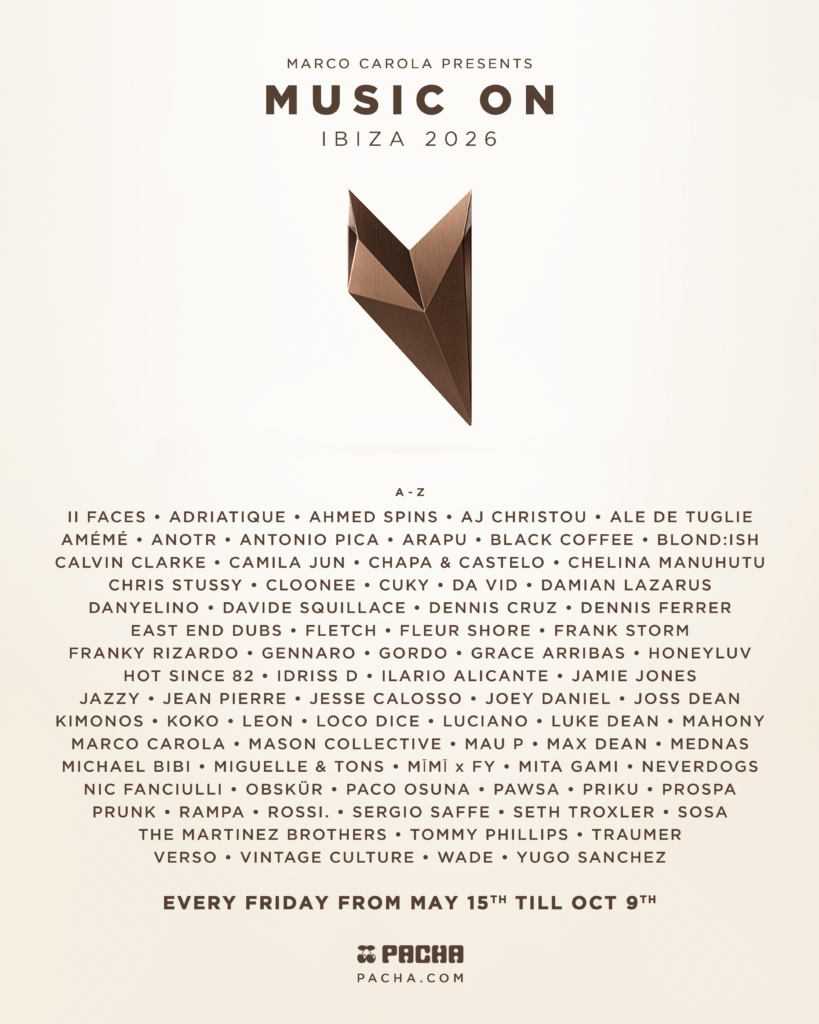 Considerada o epicentro da música eletrônica mundial, Ibiza recebe, a cada verão, milhares de fãs e profissionais da indústria. O Pacha Ibiza se mantém como um dos clubs mais tradicionais e desejados da temporada, consolidando as sextas-feiras da Music On como um dos encontros mais aguardados do calendário europeu.